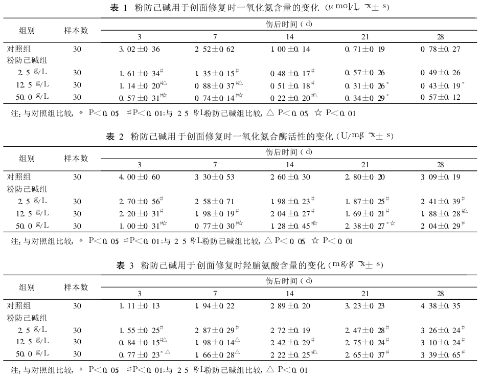 粉防己碱对创面修复组织中一氧化氮和一氧化氮合酶的影响 刘德伍、李国辉、刘德明 一、材料与方法 1、动物模型及分组:健康成年新西兰白兔(江西省医学实验动物中心)30只,雌雄各半,体重(2.30±0.20)kg。 实验前适应性喂养2d,用氯胺酮50mg/kg、安定2mg/kg肌肉注射麻醉。于每只兔的双耳腹侧各做两个边长 2.样品处理及检测指标: (1)一氧化氮(NO)含量测定:采用硝酸还原酶法,试剂盒购自南京建成生物工程研究所。 (2)一氧化氮合酶(NOS)活性测定:采用血红蛋白氧化法。NOS以左旋精氨酸(L-Arg)为底物,催化NO与氧合血红蛋白(HbO2)反应生成高铁血红蛋白,在530nm波长下测定吸光度(A)值。 (3)羟脯氨酸(HPr)含量测定:采用氯胺-T氧化法,用DU640型核酸蛋白分析仪于波长562nm下测定A值。根据上述试剂盒说明书,将所测A值转换为相应的单位值。 二、结果 NO含量、NOS活性、羟脯氨酸含量测定结果见表1~3。 三、讨论 在机体创伤修复过程中,皮肤内源性NO被大量释放入受损的局部组织,直接或与其他因子相互作用,参与创面修复与瘢痕形成过程,提示调节NO含量及NOS活性可能有助于控制创伤的修复。 本实验结果显示,粉防己碱与NO含量和NOS活性在创伤修复过程中表现为剂量依赖性。低浓度粉防己碱组在创伤初期的3—7d中,羟脯氨酸含量较对照组明显增高,在创伤初期能够发挥促进兔耳创面修复的作用;较高浓度的粉防己碱组羟脯氨酸含量反而偏低,创面愈合时间延长。其原因可能是皮肤创伤后机体产生多种炎症介质,它们既介导早期炎症反应对组织的损害,也参与组织的修复过程。 粉防己碱具有抗炎作用,可抑制炎性细胞趋化、黏附和炎症介质的释放。小剂量粉防己碱在创伤初期可抑制NO等过度表达,可减轻对组织的损害;剂量过大时在创伤后期也表现为抑制组织修复。 Efron等利用鼠皮下埋植聚乙烯乙醇海绵的创伤模型,向伤口注入选择性诱生型NOS抑制剂(S-methylisothiourea),结果能够减少NO的产生并降低海绵内羟脯氨酸含量。笔者分析,粉防己碱可能通过降低NO水平进而降低细胞毒作用和延缓组织纤维化进程。NO的双重作用除了与自身复杂的理化及生物学特性有关外,还受内环境氧化还原状态、NOS的类型以及与其他因子相互作用的影响,因此研究结果容易出现多样性和复杂性,尚有待于今后进一步探讨。 参考文献:略 |